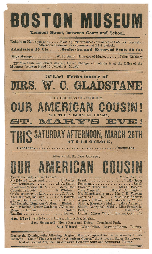 Handbill for a performance of Our American Cousin at the Boston Museum, one page, 4.5 x 7.75, March 26, [1859]. The cast list includes W. Warren as Asa Trenchard, J. Davies as Edward Trenchard, and H. Bascom as Florence Trenchard. In fine condition, with trivial loss to the upper left corner tip. President Abraham Lincoln would be assassinated during the performance of the play by Laura Keene's company at Ford's Theatre in Washington, DC, on April 14, 1865.