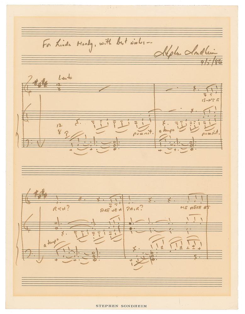 AMQS on an off-white 9.5 x 12.5 musically lined sheet, signed and inscribed at the top in black felt tip, “For Linda Moody, with best wishes—Stephen Sondheim, 9/5/86.” Sondheim then proceeds to write the first four bars of music to ‘Send in the Clowns,’ annotated on two three-stave systems, with holograph tempo directive and added lyrics. In fine condition, with toning from prior display.