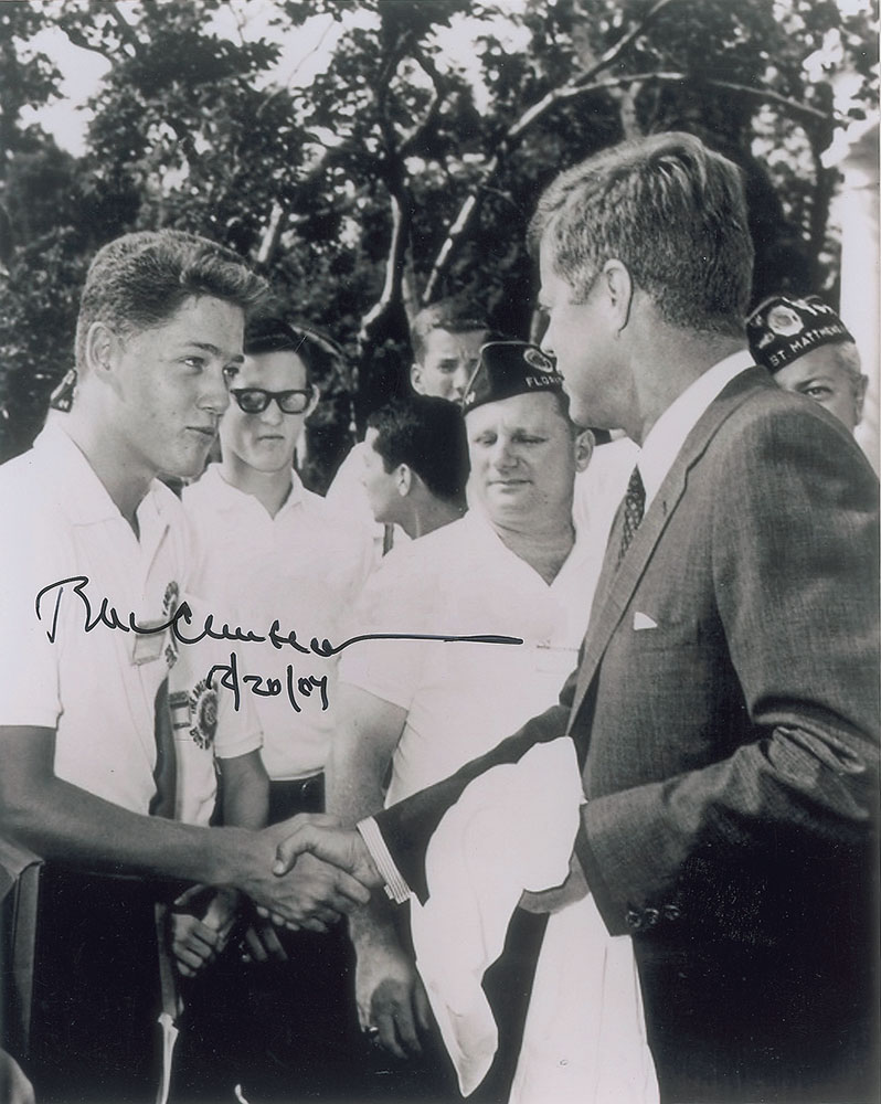 Glossy 8 x 10 photo of Boys Nation delegate Bill Clinton shaking hands with President John F. Kennedy at the White House on June 6, 1963, signed in black felt tip, "Bill Clinton, 12/20/07.” In very fine condition.