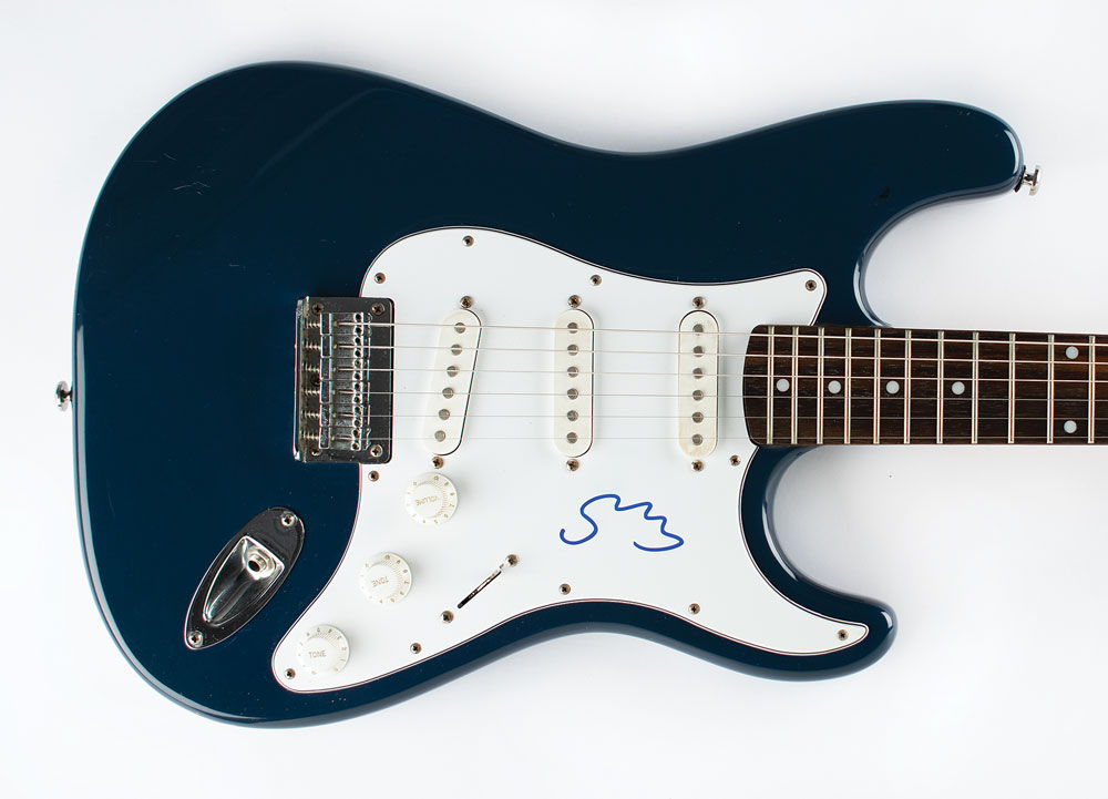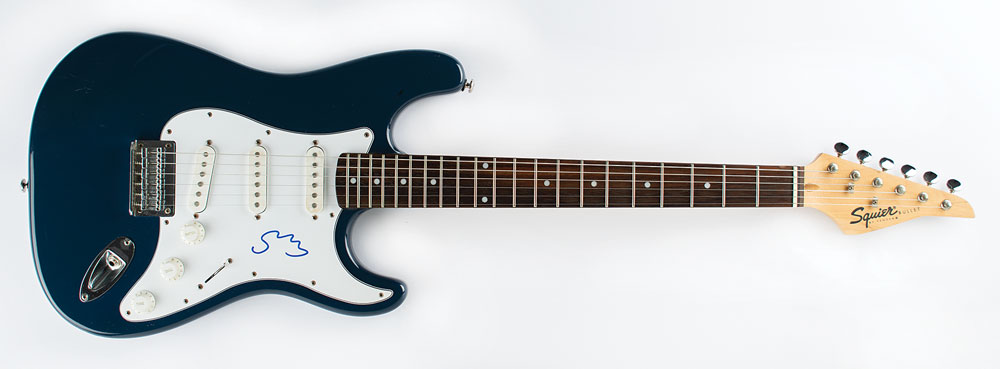 Dark blue-bodied Fender Squier Bullet Stratocaster electric guitar, signed on the white pickguard in blue felt tip by Sting. In fine condition.