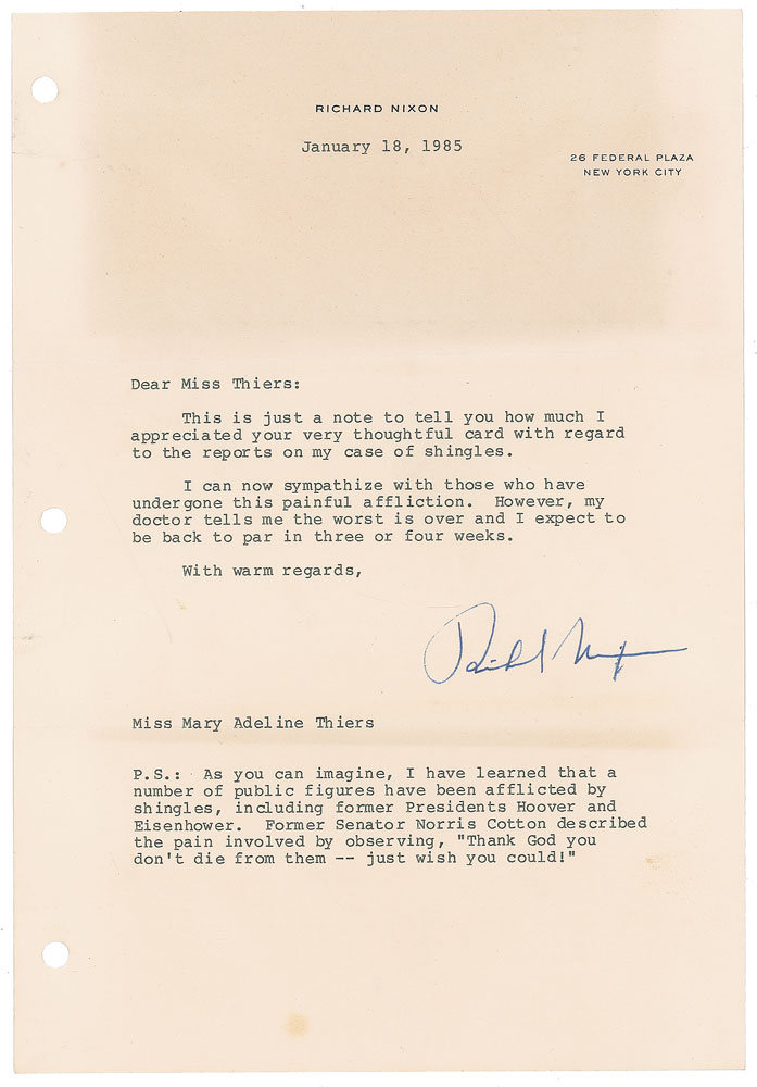 TLS, one page, 7.25 x 10.5, personal letterhead, January 18, 1985. Letter to Mary Adeline Thiers, in full: "This is just a note to tell you how much I appreciated your very thoughtful card with regard to the reports on my case of shingles. I can now sympathize with those who have undergone this painful affliction. However, my doctor tells me the worst is over and I expect to be back to par in three or four weeks." Nixon adds a postscript: "As you can imagine, I have learned that a number of public figures have been inflicted by shingles, including former Presidents Hoover and Eisenhower." In very good to fine condition, with areas of light toning, and three file holes to the left edge.