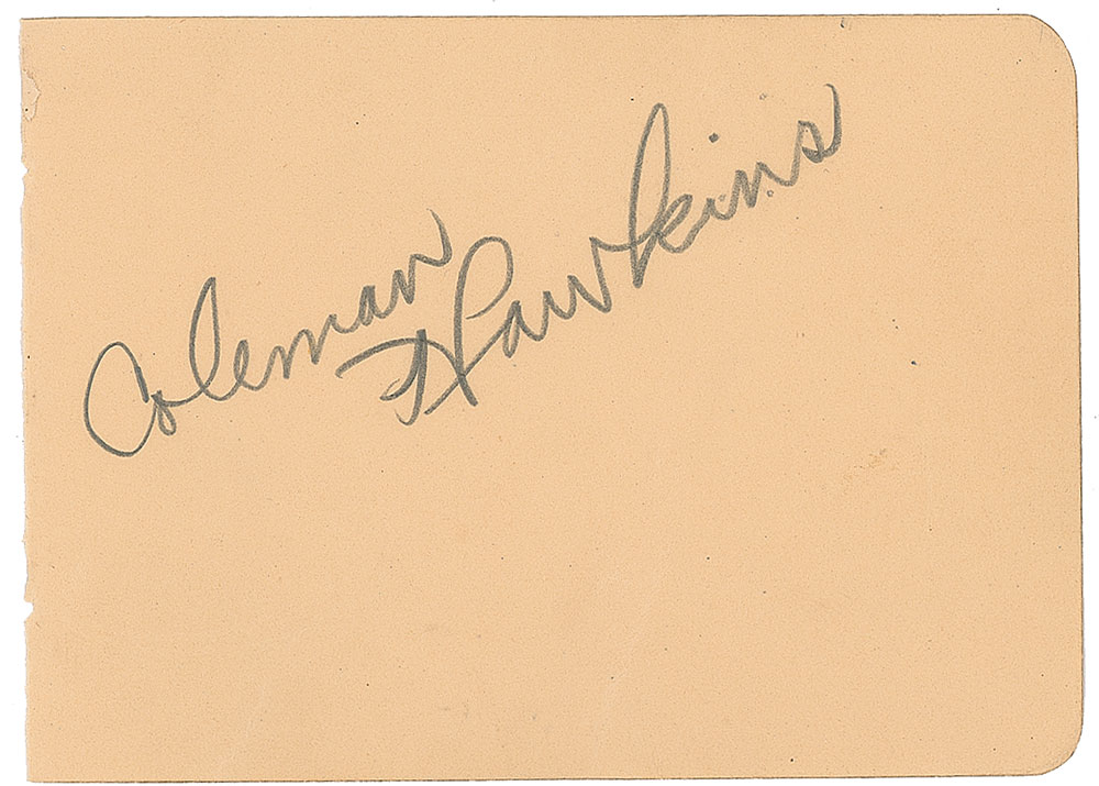 American jazz tenor saxophonist (1904-1969), nicknamed 'Hawk' and occasionally 'Bean,' who was strongly associated with the swing music and big band era, and played a role in the development of bebop in the 1940s. Vintage pencil signature, "Coleman Hawkins,” on a beige 3.75 x 2.75 album page. In fine condition.