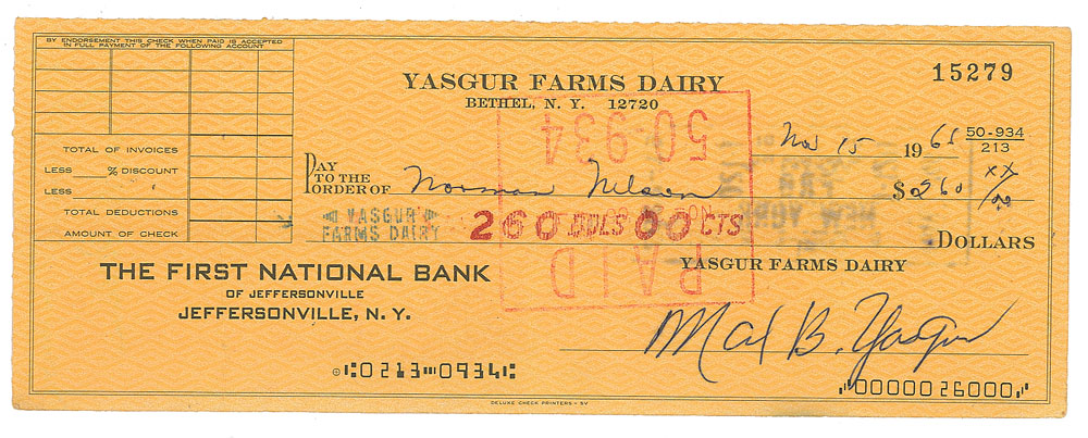 Farmer (1919-1973) who owned the dairy farm in Bethel, New York where the Woodstock Music and Art Fair was held between August 15 and 18, 1969. Yasgur Farms Dairy check, 8.25 x 3, filled out in another hand and signed by Yasgur, "Max B. Yasgur," payable to Norman Nelson for $260, November 15, 1965. In fine condition.