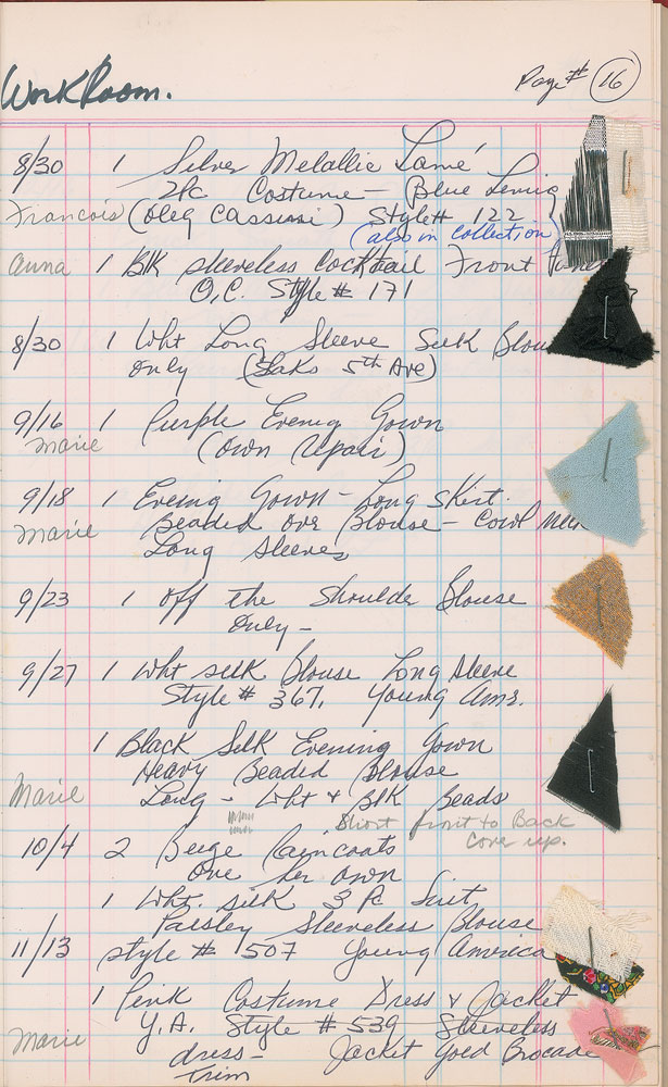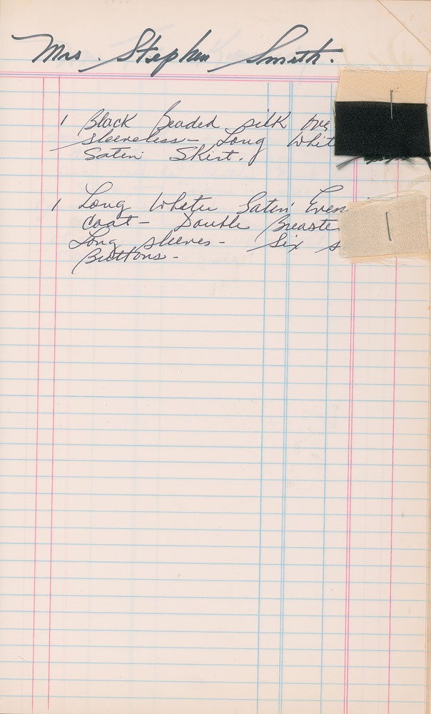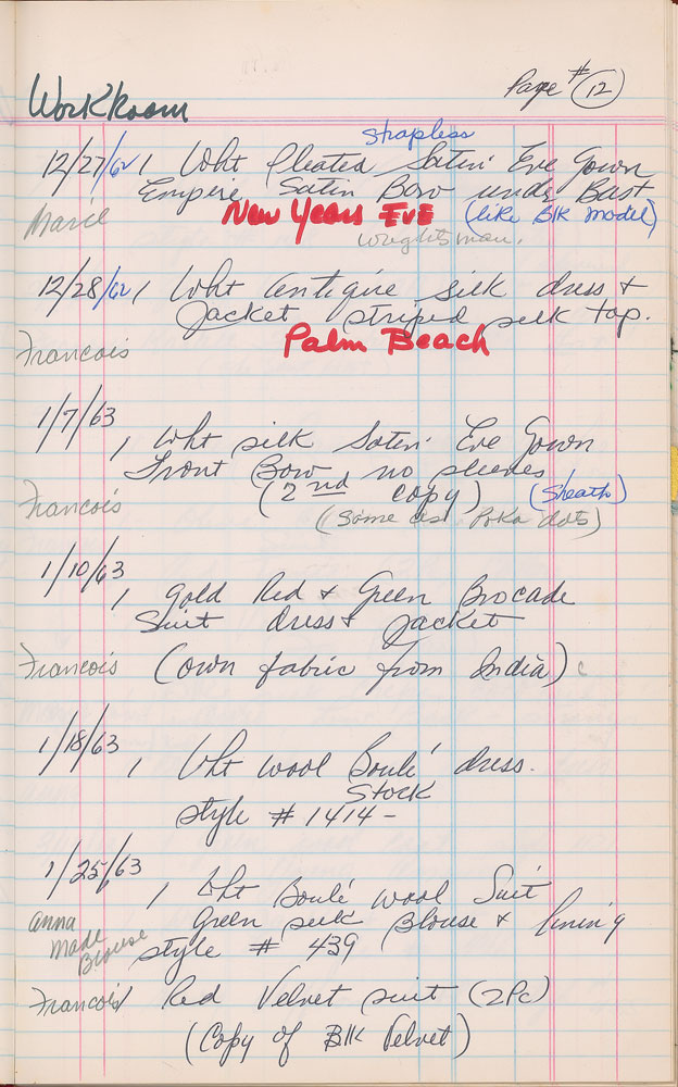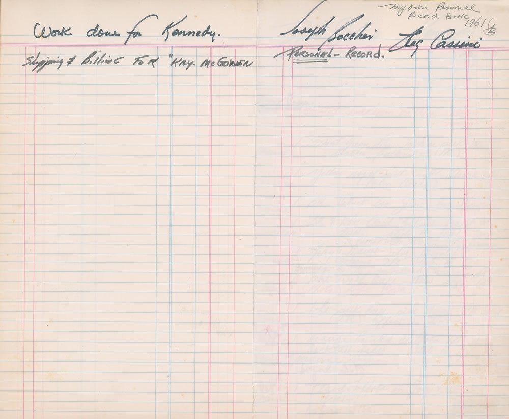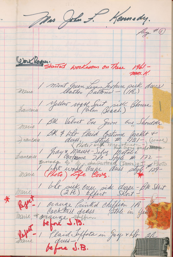 Important red ledger from the Oleg Cassini workroom kept by design coordinator Joseph Boccheir, 7.75 x 12.5, with approximately 17 pages devoted to model sessions for Jacqueline Kennedy's designs, circa 1960-1964. These pages, accomplished in pencil, pen, and red ink, describe the designs (e.g. "1 Wht silk gown trimmed in white satin plus stole" and "Mint green silk eve gown") and make note of when they were worn (e.g. "Life Cover," "Palm Beach Church Photo," and "New Years Eve"), or if they were rejected. Approximately 20 entries include small fabric samples stapled alongside the description of the garment. One of the last entries, dated November 13, [1963], ominously notes a "Pink Costume Dress & Jacket," with associated fabric sample—an eerie foreshadowing of the pink Chanel suit she wore at the time of JFK's assassination just nine days later. In the back of the book are several entries for Kennedy-related figures, including Princess Lee Radziwill, Mrs. Sargent Shriver, Mrs. Ted Kennedy, and Mrs. Stephen Smith. In fine condition. Chronicling the process behind the fashion choices made by the iconic first lady, this is a remarkable piece of both fashion and American history.