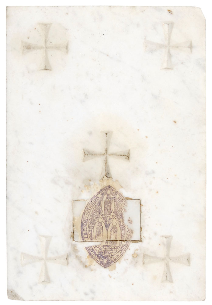 Stone tablet from the Cathedral of Notre Dame, measuring approximately 5 x 7.5 x .25, with crosses carved into each corner and the center of the stone. The elliptically shaped paper seal of Cardinal Suhard, Archbishop of Paris, is affixed near the bottom. Reverse bears an affixed tag stamped with the seal of Archbishopric of Paris, reading, in part (translated): "I?certify that this Stone Altar?consecrated to the Archbishopric of Paris," and dated Paris, May 26, 1946. Signed at the conclusion by the Secretary of the Archbishopric to certify the statement, though much of the tag and signature has worn off. In very good condition, with a few edge chips and heavy wear to affixed seal and tag.