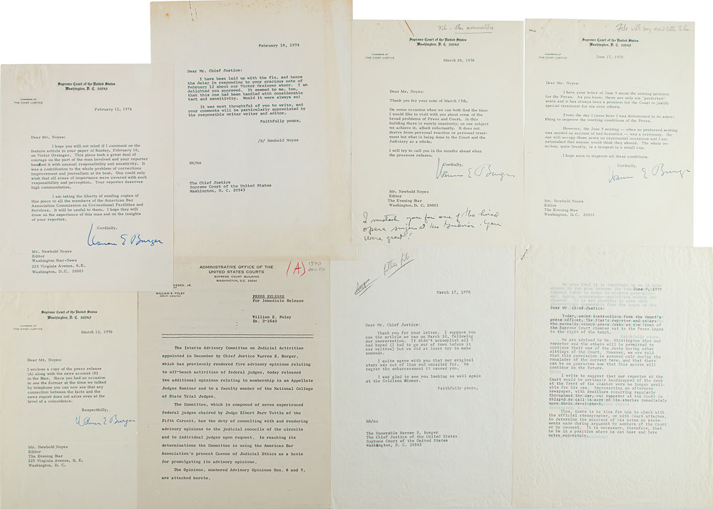 Four TLSs signed "Warren E. Burger," each one page, Supreme Court of the United States letterhead, dated 1970-1974, all to Newbold Noyes, editor of the Washington Evening Star. Burger weighs in on an article about prison reform and the case of Victor J. Orsinger ("This piece took a great deal of courage on the part of the man involved and your reporter handled it with unusual responsibility and sensitivity. It was a contribution to the whole problem of corrections improvement and journalism at its best"), transmits a press release, asks to "visit with you about some of the broad problems of Press and Court," and notes that "from the day I came here I was determined to do something to improve the working conditions of the Press." In very good to fine condition, with paperclip impressions (some rusty) to the top edges. Accompanied by Noyes's retained carbon copies of his letters to Burger, and a clipping of the Orsinger article.