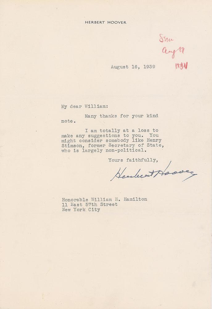 TLS, one page, 7.25 x 10.5, personal letterhead, August 16, 1939. Letter to William H. Hamilton, in part: "I am totally at a loss to make any suggestions to you. You might consider somebody like Henry Stimson, former Secretary of State, who is largely non-political." In fine condition.