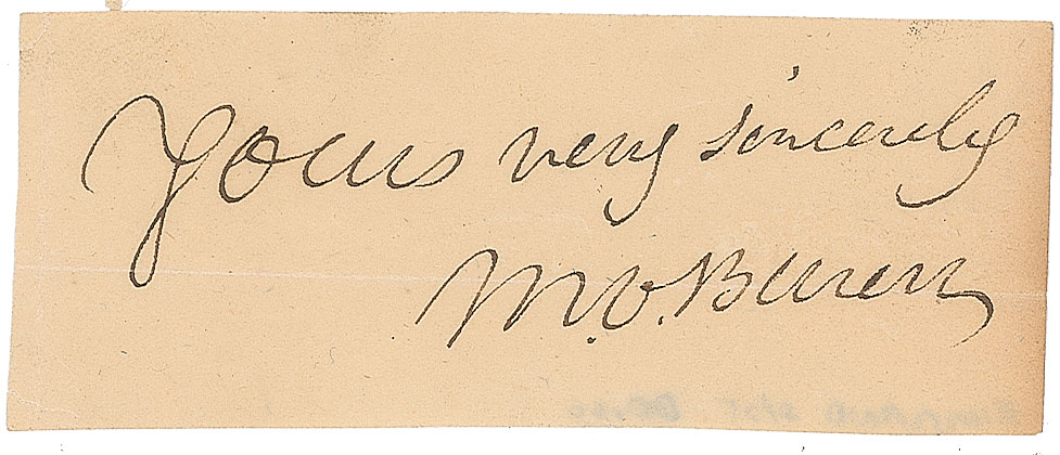 Neat ink signature, "Yours very sincerely, M. V. Buren,” on an off-white 3.25 x 1.25 slip. In fine condition, with a horizontal fold through the signature.