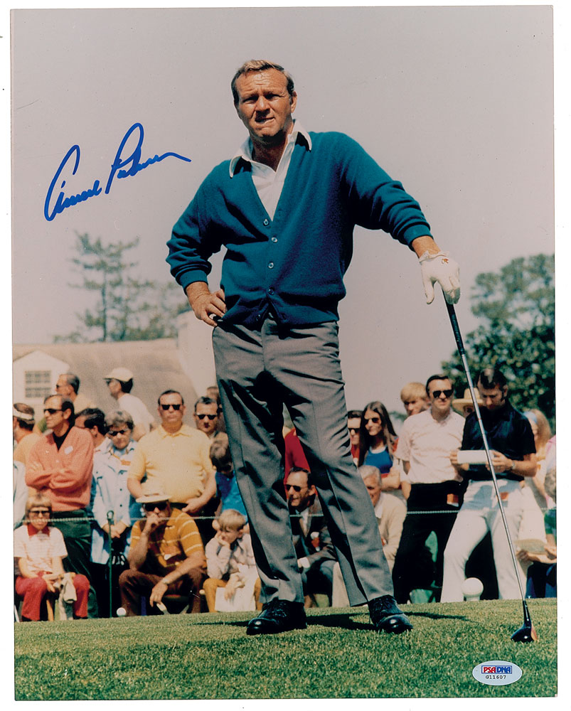Color satin-finish 11 x 14 photo of Arnold Palmer in a fantastic full-length pose, signed in blue felt tip. In fine condition, with a PSA/DNA label affixed to lower right corner (certificate not present).