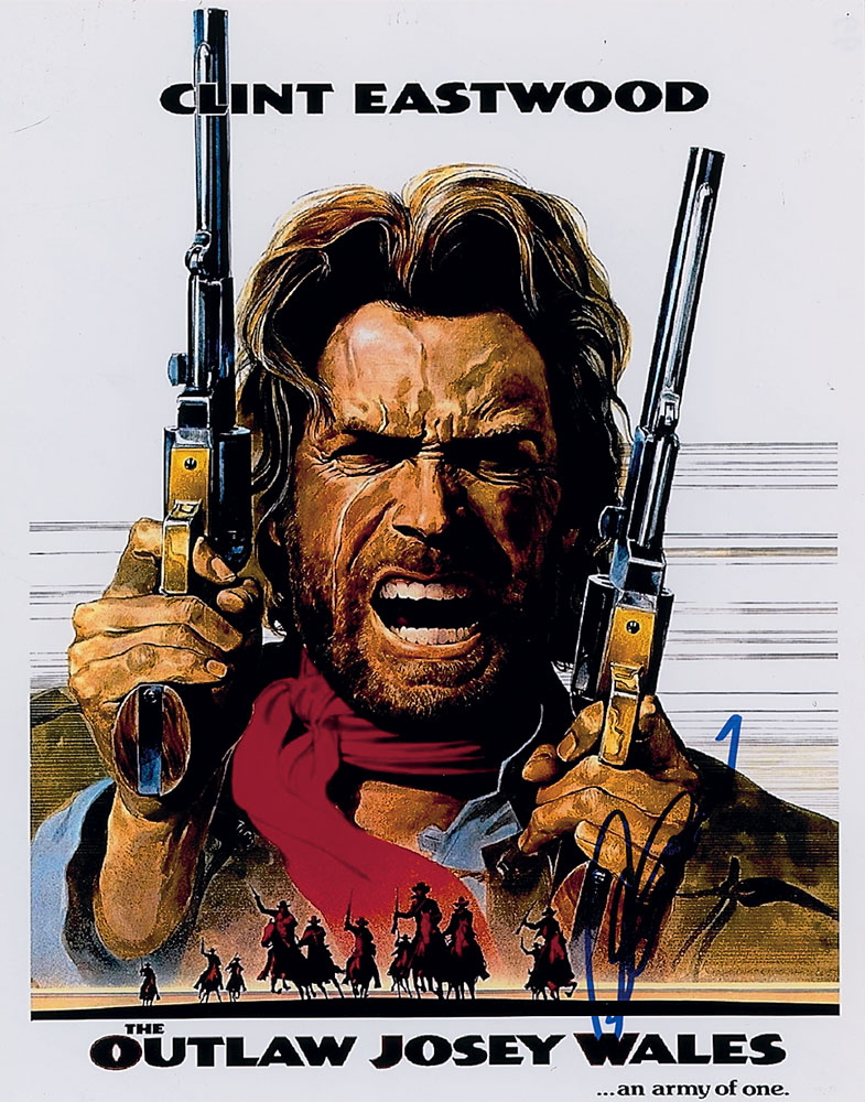 Color satin-finish 11 x 14 photo of the poster for the 1976 Western film The Outlaw Josey Wales, signed in blue felt tip by Clint Eastwood. In fine condition.