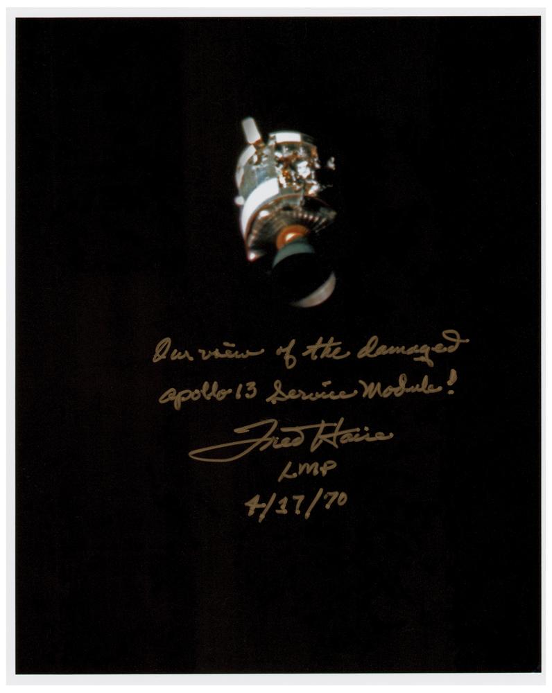 Color satin-finish 8 x 10 photo of the crippled Apollo 13 service module floating in space, signed in gold ink, "Our view of the damaged Apollo 13 Service Module! Fred Haise, LMP, 4/17/70." In very fine condition.