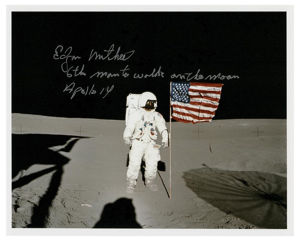Color satin-finish 10 x 8 full-length photo of LMP Mitchell standing on the moon's surface next to the American flag during the third lunar-landing mission, signed in silver ink, "Edgar Mitchell, 6th man to walk on the moon, Apollo 14." In very fine condition.