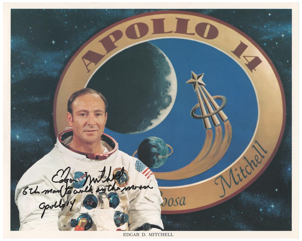 Official color 10 x 8 NASA lithograph of Mitchell posing in his white space suit against the Apollo 14 mission insignia, signed in black felt tip, "Edgar Mitchell, 6th man to walk on the moon, Apollo 14." In very fine condition.