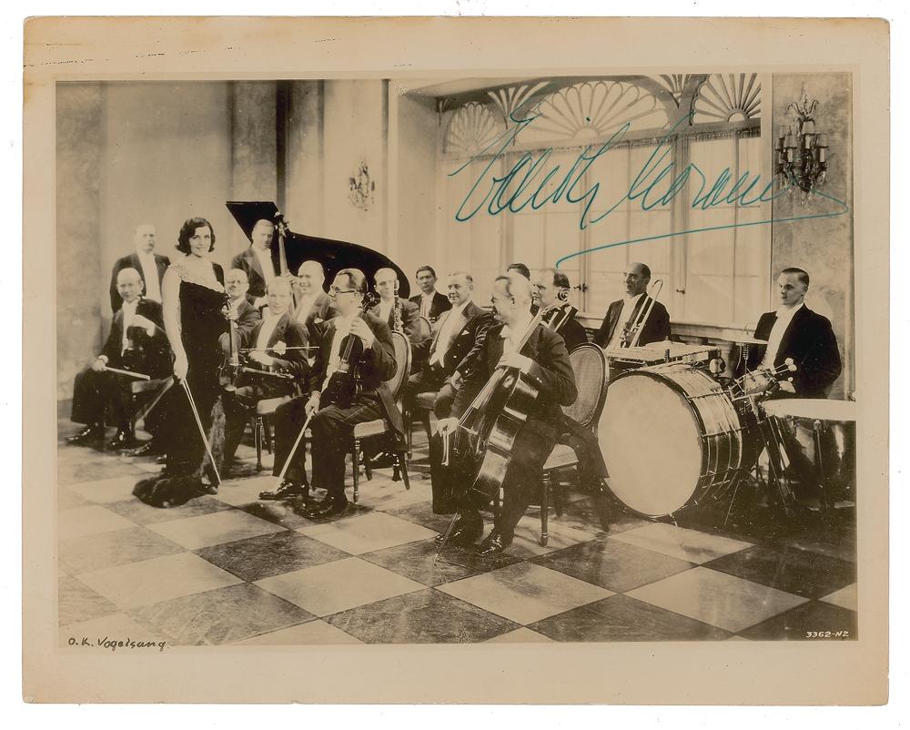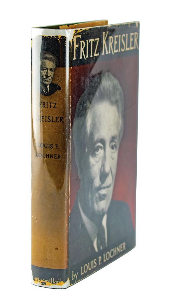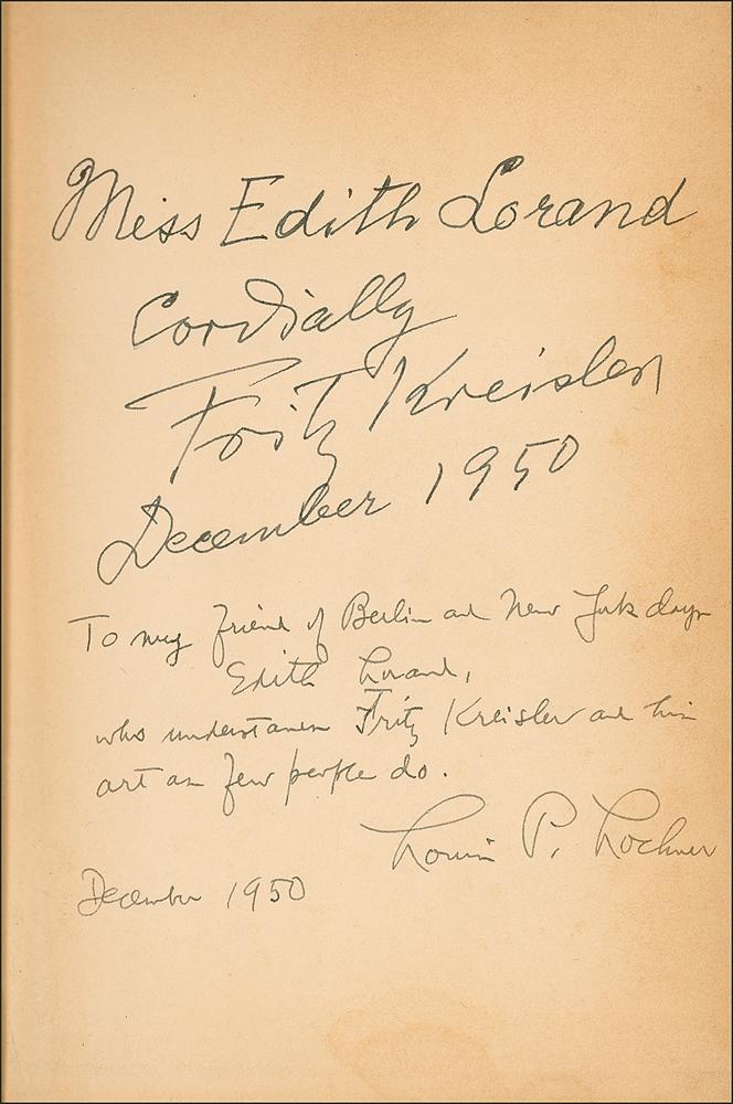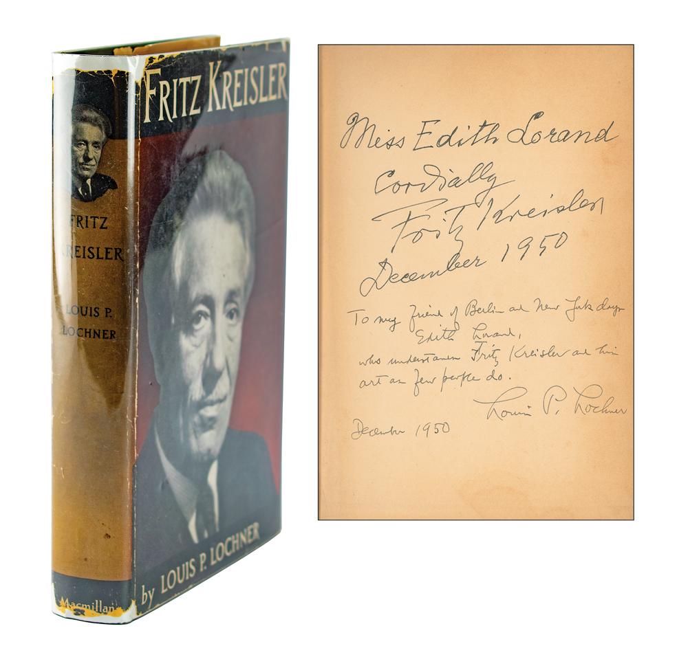 Signed book: Fritz Kreisler. First edition, first printing. NY: The Macmillan Company, 1950. Hardcover with dust jacket, 5.75 x 8.5, 455 pages. Signed and inscribed in fountain pen on the first free end page to a violinist, singer, and conductor, "Miss Edith Lorand, Cordially, Fritz Kreisler, December 1950." Also signed and inscribed by the author, Louis P. Lochner. Includes a glossy 10 x 8 photo of Lornad's Viennese Salon Orchestra, signed in fountain pen by Lorand. In very good condition, with mild toning and soiling to the signed page, heavier around the edges, touching the end of Kreisler's name and inscription; the dust jacket shows chipping at the top and bottom of the spine, scattered creasing, and mild toning and soiling.