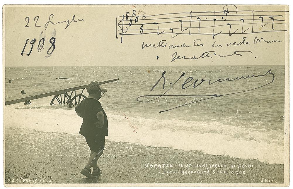 Italian composer (1857-1919) best known for his operas, particularly the beloved repertoire staple 'Pagliacci.' Appealing matte-finish 5.25 x 3.5 postcard photo of Leoncavallo at water's edge in Varazze, signed in ink "R. Leoncavallo," adding a three-measure musical quotation from his most famous Neapolitan song, 'Mattinata,' and the date of July 22, 1908. The piece was written for Enrico Caruso, who recorded it for the Gramophone Co. with Leoncavallo at the piano in 1904. In fine condition.