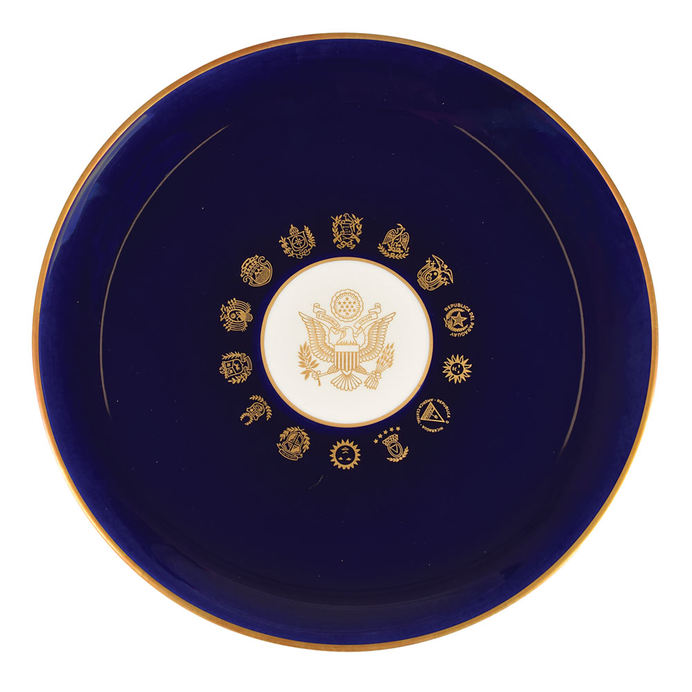 Beautiful deep cobalt blue dinner plate produced especially for the ‘Dinner of the Inter-American Press Association in honor of President John Fitzgerald Kennedy,’ held at the Hotel Americana in Miami Beach on November 18, 1963, just four days before JFK’s assassination. The plate measures approximately 10.5″ in diameter, and features gilt edging and ornamentation of the presidential seal, as well as the coats of arms of the IAPA’s 14 member states. The manufacturer's imprint on the cream underside reads, “Syracuse - China - 93 G U.S.A.” In fine condition. Accompanied by a packet containing copies of several photographs of the event and a transcript of the address Kennedy gave.