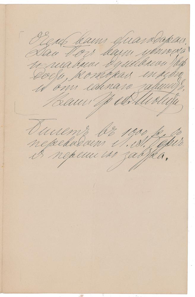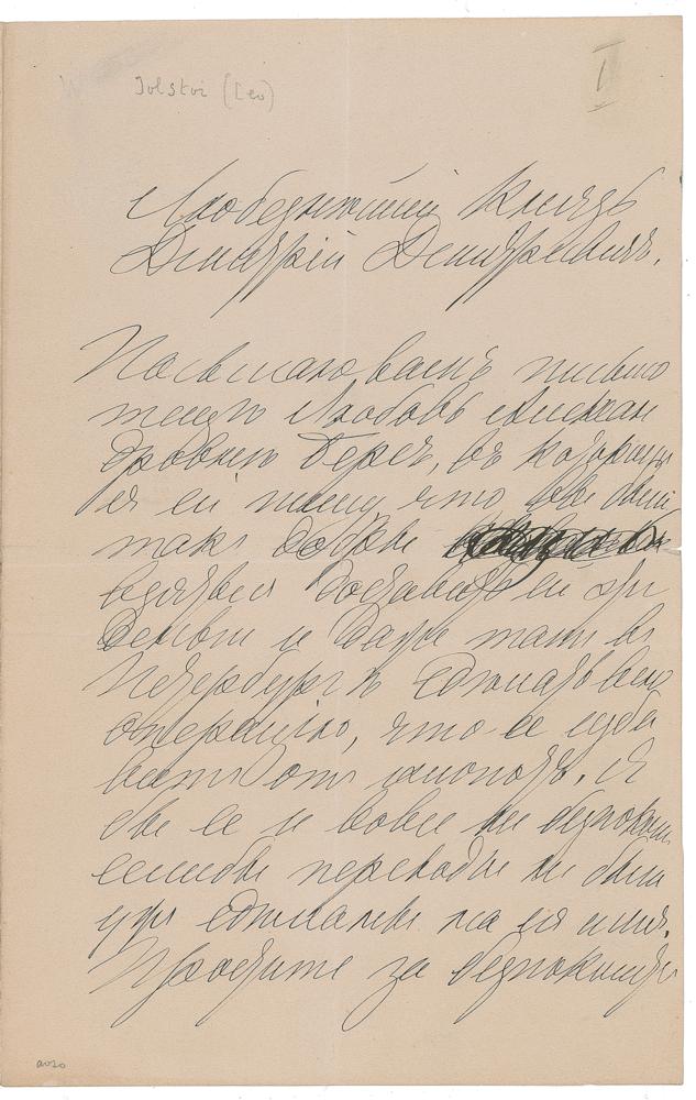 ALS in Cyrillic, signed "Count L. Tolstoy," two pages on two adjoining sheets, 5.25 x 8.5, no date. Letter to Prince Dmitry Dmitrievich, in full (translated): "I am forwarding to you the letter to my mother-in-law, Lyubov Aleksandrovna Behrs, in which I am writing to her that you were so kind to undertake to deliver this money to her, and even there, in Petersburg, to complete the transaction, thus saving her the trouble. I would not have bothered her at all had not the transfers been already made in her name. I'm sorry to trouble you. Thank you very much. May God grant you success and, most importantly, spiritual strength, which depends a lot on oneself." He adds a postscript, "Tomorrow, I shall send the 1,000-ruble bill with the transfer to L.A. Behrs." In fine condition.