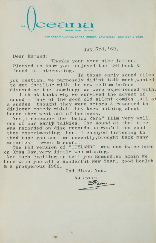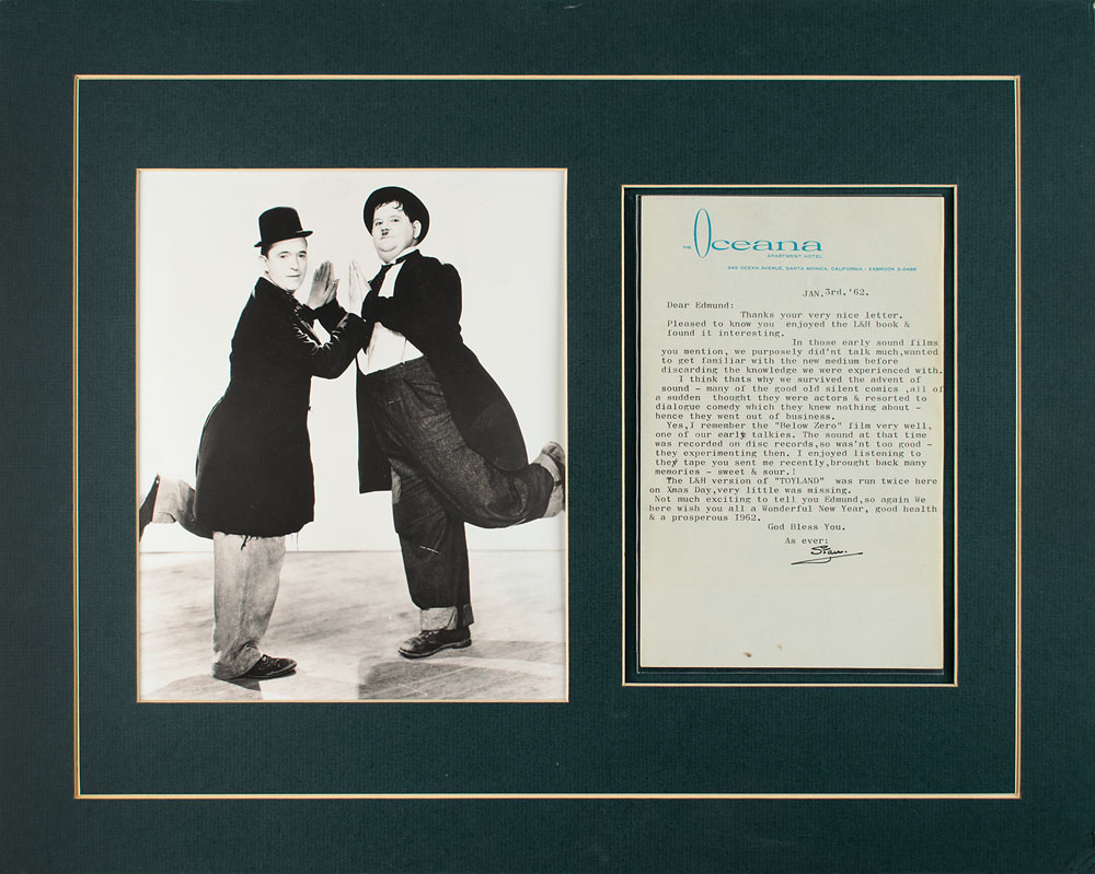 TLS signed “Stan,” one page, 5.5 x 8.5, Oceana Hotel letterhead, January 3, 1962. Letter responding to the reader of a Laurel & Hardy book, in part: "In those early sound films you mention, we purposely didn't talk much, wanted to get familiar with the new medium before discarding the knowledge we were experienced with. I think that's why we survived the advent of sound—many of the good old silent comics all of a sudden thought they were actors & resorted to dialogue comedy which they knew nothing about—hence they went out of business. Yes, I remember the 'Below Zero' film very well, one of our early talkies. The sound at that time was recorded on disc records, so wasn't too good?The L&H version of 'Toyland' was run twice here on Xmas Day, very little was missing." Nicely matted with a portrait of the famous comedy duo to an overall size of 20 x 16. In fine condition.