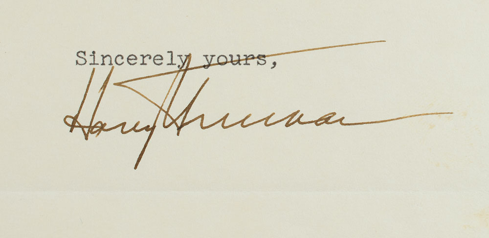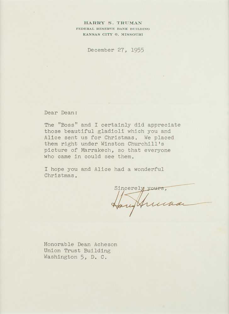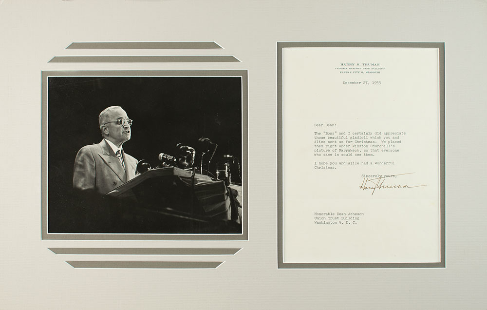 TLS, one page, 7 x 9.5, personal letterhead, December 27, 1955. Letter to Dean Acheson, his former Secretary of State. In full: "The 'Boss' and I certainly did appreciate those beautiful gladioli which you and Alice sent us for Christmas. We placed them right under Winston Churchill's picture of Marrakech, so that everyone who came in could see them." Nicely double-matted to an overall size of 22 x 14. In fine condition.
