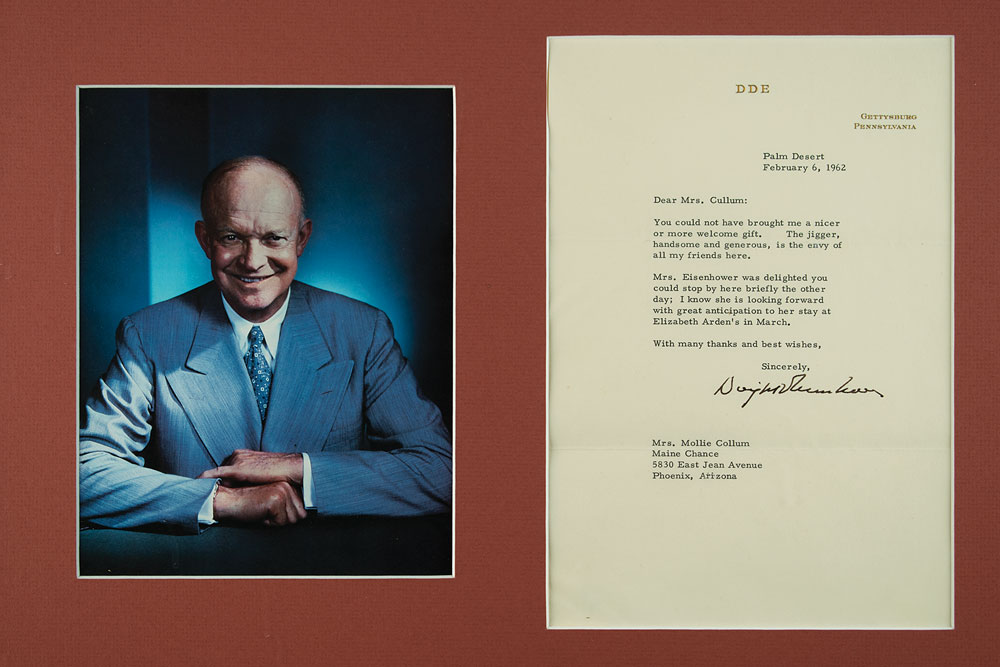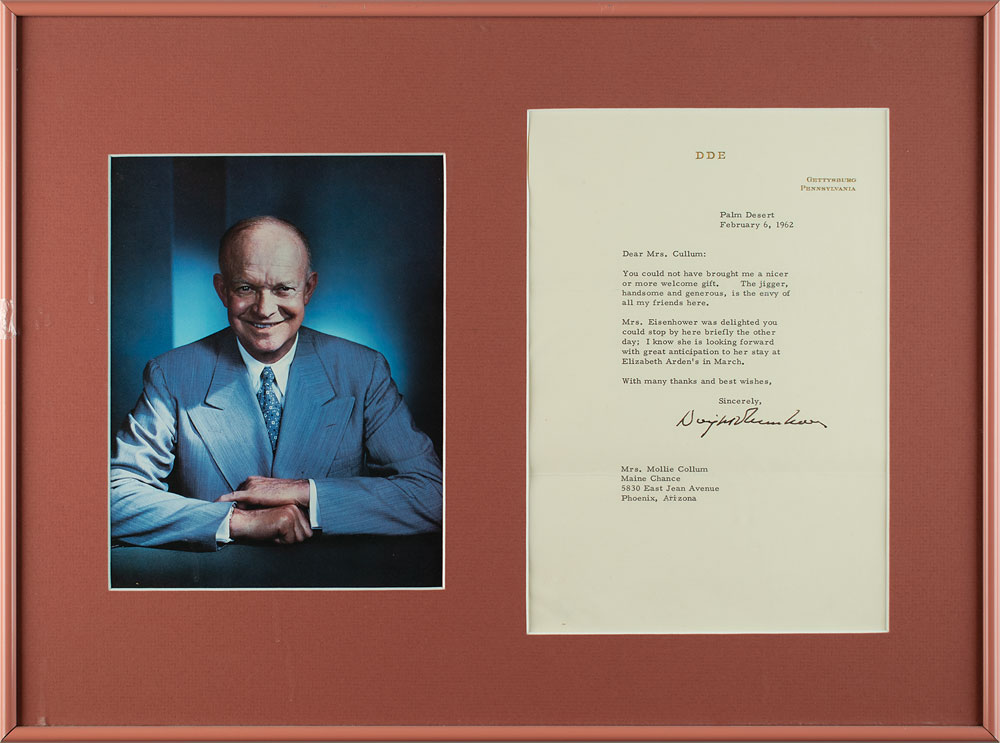 TLS, one page, 7 x 10.25, personal letterhead, February 6, 1962. Letter to Mollie Collum, in part: "You could not have brought me a nicer or more welcome gift. The jigger, handsome and generous, is the envy of all my friends here. Mrs. Eisenhower was delighted you could stop by here briefly the other day; I know she is looking forward with great anticipation to her stay at Elizabeth Arden's in March." Nicely matted and framed with a portrait to an overall size of 19.25 x 14.5. In fine condition, with some creasing to the left side.