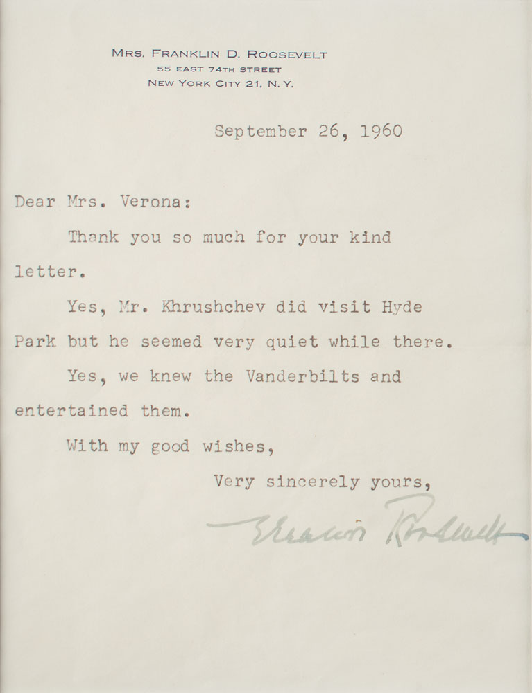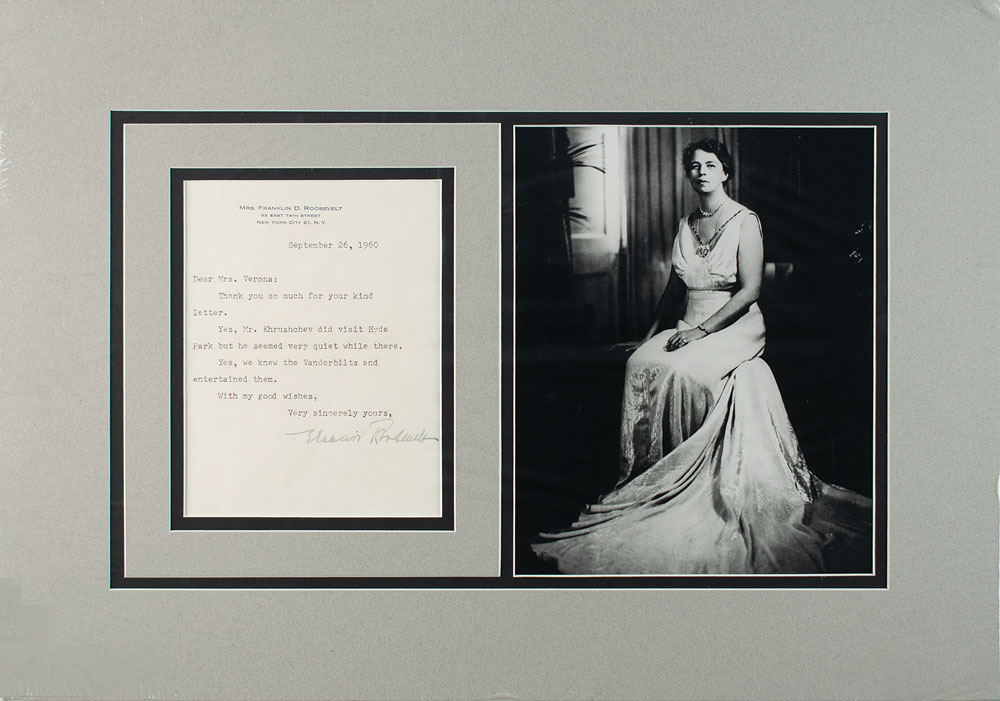TLS, one page, 5 x 6.75, personal letterhead, September 26, 1960. Letter to Mrs. Joseph Verona, in part: "Yes, Mr. Khrushchev did visit Hyde Park but he seemed very quiet while there. Yes, we knew the Vanderbilts and entertained them." Double-matted with an elegant portrait to an overall size of 20 x 14. In fine condition.