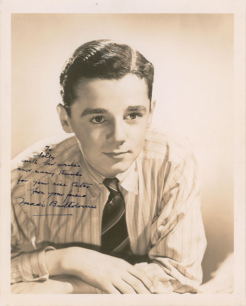British-born actor (1924-1992) whose title role in MGM's David Copperfield made him an overnight star; he went on to appear in such classics as Anna Karenina, Little Lord Fauntleroy, and Captains Courageous. Vintage matte-finish 8 x 10 portrait of the child star, signed and inscribed in fountain pen, "To Solly, with best wishes and many thanks for your nice letter, from your friend, Freddie Bartholomew.” In very fine condition.