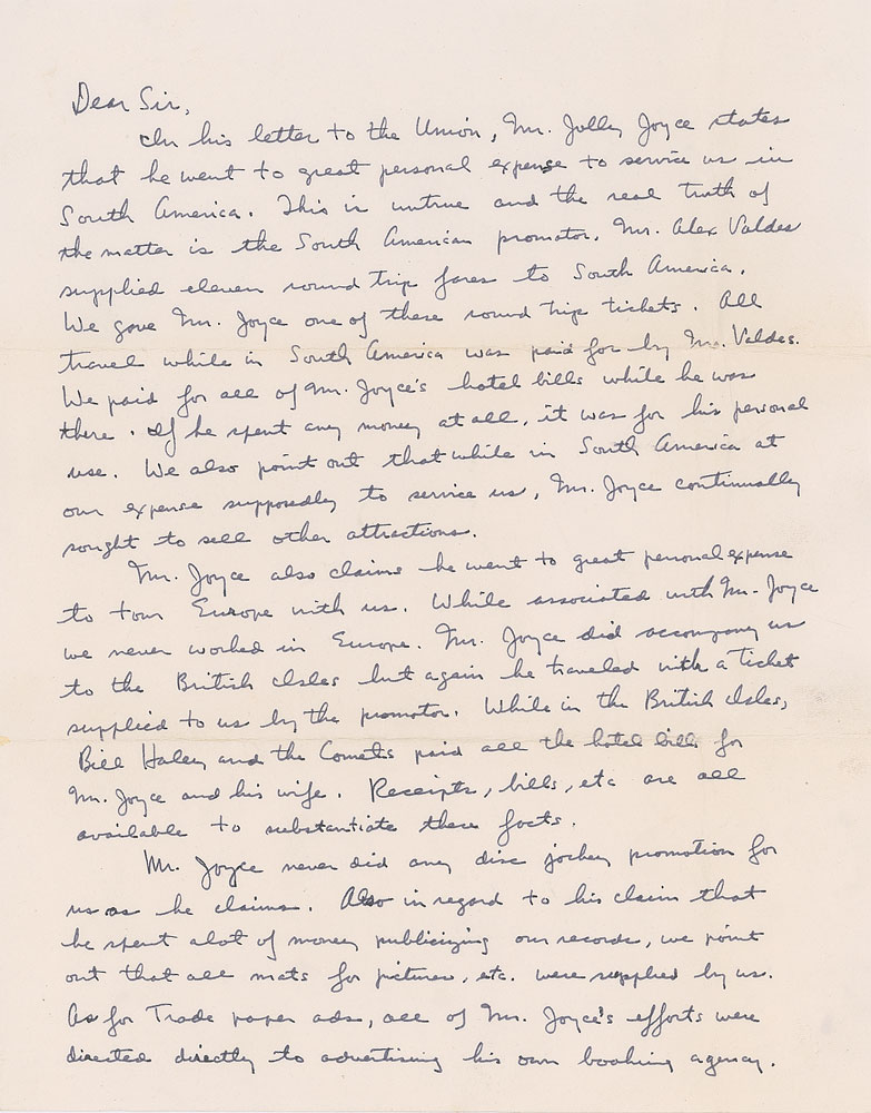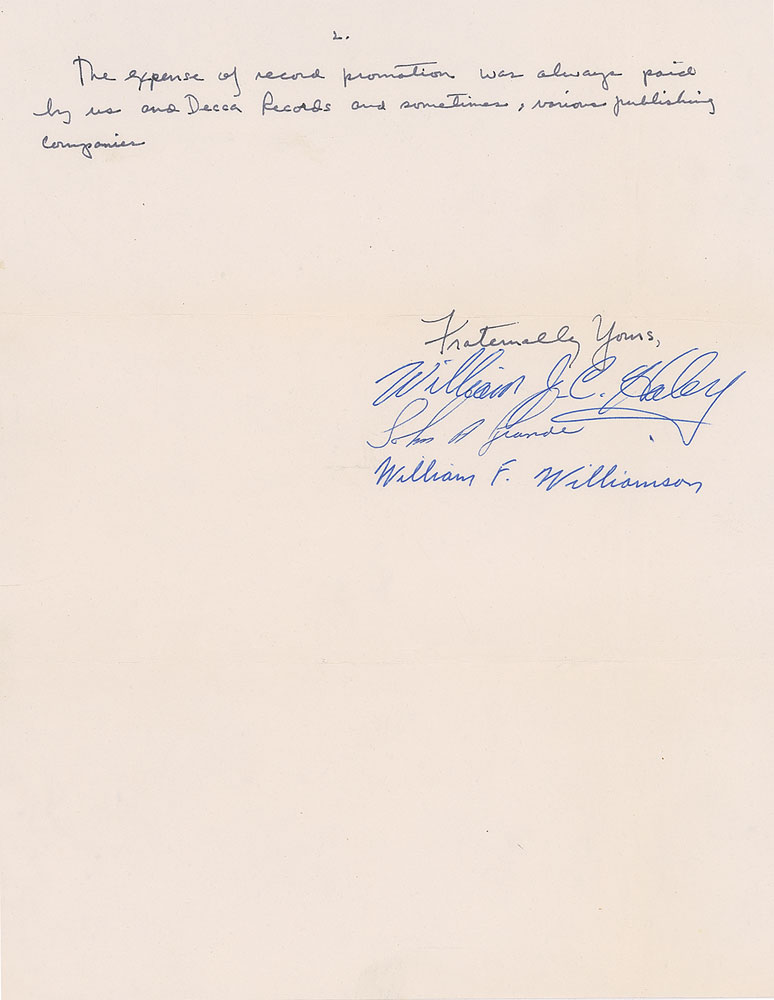 LS signed "William J. C. Haley," two pages, 8.25 x 10.5, no date. Letter responding to a union dispute. In part: "Joyce states that he went to great personal expense to service us in South America. This is untrue and the real truth of the matter is the South American promoter, Mr. Alex Valdes, supplied eleven round trip fares?We gave Mr. Joyce one of these round trip tickets?We paid for all of Mr. Joyce's hotel bills while he was there?Mr. Joyce never did any disc jockey promotion for us as he claims?The expense of record promotion was always paid by us and Decca Records." Signed at the conclusion in full by Haley, as well as his Comets Johnny Grande, "John A. Grande," and Billy Williamson, "William F. Williamson." In fine condition. This letter must predate 1963, as Grande and Williamson left the band in that year.