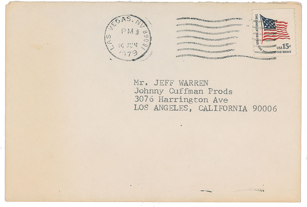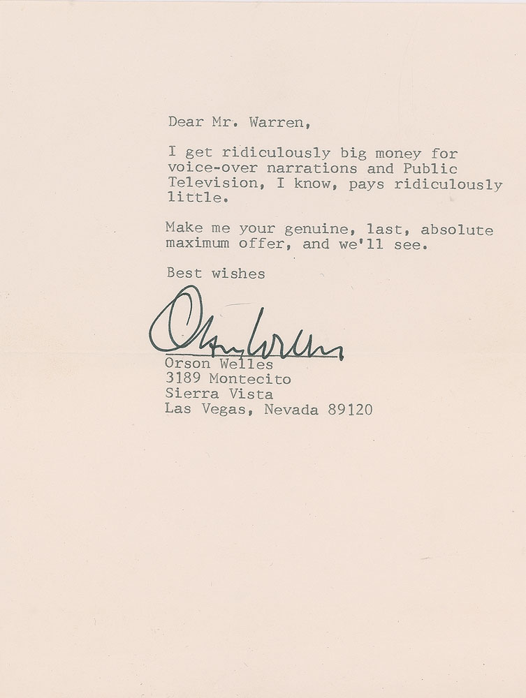 TLS, one page, 5.75 x 7.75, June 16, 1979. Candid letter to Jeff Warren of Johnny Cuffman Productions, in full: "I get ridiculously big money for voice-over narrations and Public Television, I know pays ridiculously little. Make me your genuine, last, absolute maximum offer, and we'll see." In fine condition. Accompanied by the original mailing envelope.