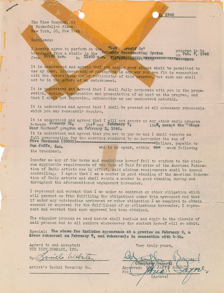 DS, one page, 8.5 x 11, 1945. Agreement by which Bogart agrees to perform on the "'Let Yourself Go' program to be broadcast from a studio in the Columbia Broadcasting System on Feb. 7, 1945" for a fee of $5,000. Signed at the conclusion in fountain pen by Bogart, and countersigned by an agent and Biow Company representative. In good to very good condition, with edge tears, a tape stain to the center, paper loss to the top, and old yellowed tape repairs; the signature area is completely unaffected by any flaws, and could easily be clipped off if desired.