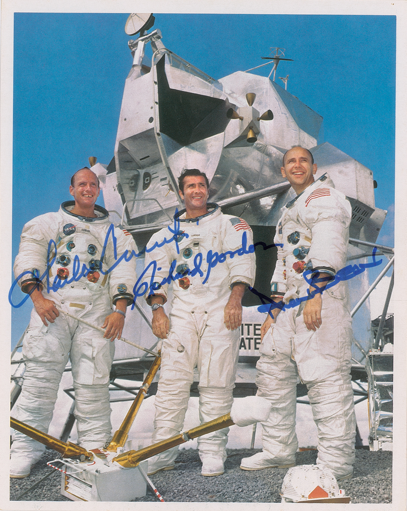 Official color 8 x 10 NASA lithograph of the Apollo 12 crew posing in their white space suits in front of a Lunar Module, signed in blue felt tip by Charles Conrad, Richard Gordon, and Alan Bean. In very fine condition.