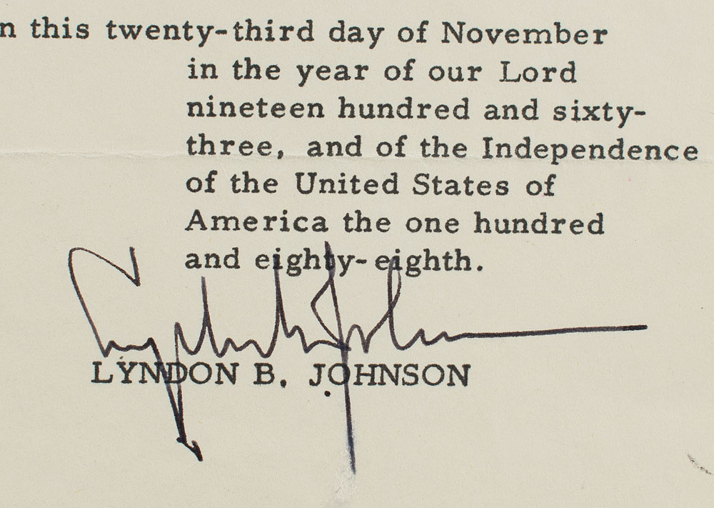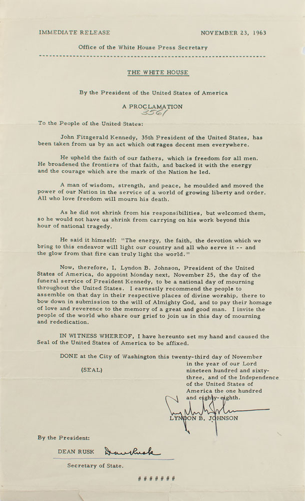 Extraordinary, historic press release announcing the assassination of John F. Kennedy, one page, 8.5 x 14, November 23, 1963, signed at the conclusion in ink by President Lyndon B. Johnson and Secretary of State Dean Rusk. Headed "Immediate Release / Office of the White House Press Secretary," in part: "To the People of the United States: John Fitzgerald Kennedy, 35th President of the United States, has been taken from us by an act which outrages decent men everywhere. He upheld the faith of our fathers, which is freedom for all men. He broadened the frontiers of that faith, and backed it with the energy and the courage which are the mark of the Nation he led. A man of wisdom, strength, and peace, he moulded and moved the power of our Nation in the service of a world growing liberty and order. All who love freedom will mourn his death?Now, therefore, I, Lyndon B. Johnson, President of the United States of America, do appoint Monday next, November 25, the day of the funeral service of President Kennedy, to be a national day of mourning." In fine condition. Provenance: The Malcolm S. Forbes Collection of American Historical Documents, Christie's. A remarkable document from the aftermath of JFK's tragic death in Dallas.