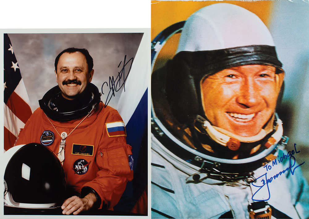 Two items: a color 8.25 x 11.5 heavyweight paperstock print of Leonov in his space suit, signed and inscribed in blue felt tip, "To Michael, Alexei Leonov"; and a color satin-finish 8 x 10 photo of Usachov in his orange flight suit, signed in black felt tip, "Yury Usachov." In overall fine condition, with some edge creasing to Leonov.