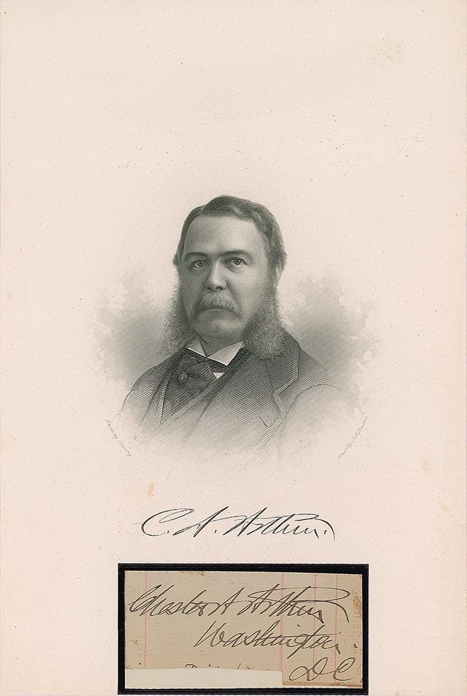 Ink signature, "Chester A. Arthur, Washington, DC,” on an off-white 3.5 x 1.75 slip. Displayed on an engraved portrait of Arthur featuring a pre-printed facsimile signature. In fine condition, with a small stain to the right edge.