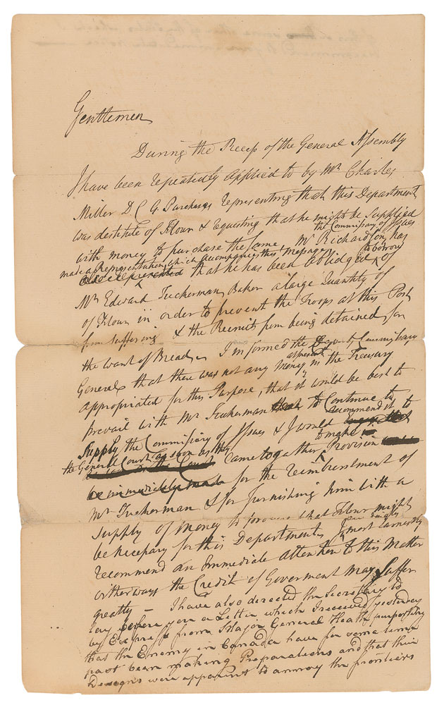 Revolutionary War-dated manuscript draft of a message to the Massachusetts General Assembly, written in the hand of Governor John Hancock and Secretary of the Commonwealth John Avery, one page, both sides, 7.5 x 12.75, September 24, 1781. The longer first portion of the draft is written by Avery and reads: “Gentlemen, During the Recess of the General Assembly I have been repeatedly applied to by Mr. Charles Miller D. C. G. Purchases representing that this Department was destitute of Flour & requesting that he might be supplied with money to purchase the same. Mr. Richardson, the Commissary of supplies has made a Representation, which accompanies this message, that he has been oblidged to borrow of Mr. Edward Tuckerman Baker a large Quantity of Flour in order to prevent the Troops at this Post from suffering & the Recruits from being detained for the want of Bread—Informed the Deputy Commissary General that there was not any money in the Treasury appropriated for this Purpose, that it would be best to prevail with Mr. Tuckerman to Continue to Supply the Commissary of these & I would recommend it to the General Court as soon as they came together to make Provision for the reimbursement of Mr. Tuckerman & for furnishing him with a supply of money to procure that Flour as might be necessary for this Department I most earnestly recommend an Immediate attention to this Matter either way the Credit of Government May Suffer greatly.”