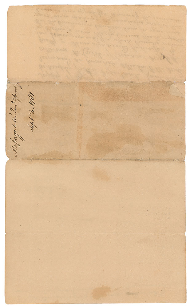 The remaining section, written by Hancock, reads as follows: “I have also directed the Secretary to lay before you a Letter which I received yesterday by Express from Major General Heath purporting that the Enemy in Canada have for some time past been making Preparations and that their Designs were apparent to annoy the frontiers of this or some other of this State which I recommend to you immediate notice.” In very good condition, with light staining, and splitting to the fragile horizontal folds.