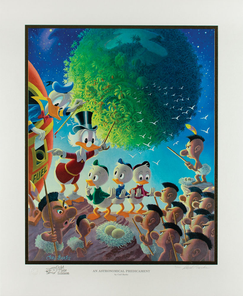 Limited edition color 21 x 25.5 lithograph of a Carl Barks oil painting entitled 'An Astronomical Predicament,' Gold Plate Edition, numbered 3/100, printed with 18 continuous-tone colors on Opalesque silk by The Black Box of Chicago, signed in the lower border in pencil by Barks. The sci-fi scene shows Uncle Scrooge McDuck, Donald Duck, and Huey, Dewie, and Louie encountering the natives of a barren asteroid. In fine condition. ‘An Astronomical Predicament,’ the fifteenth Carl Barks lithograph in a series produced by Another Rainbow Publishing, was based on the story ‘Island in the Sky,’ which was originally published in Uncle Scrooge #29 in March-May 1960. Accompanied by a certificate of authenticity.