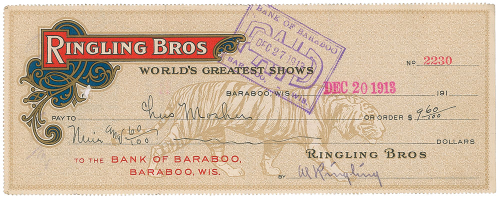 One of the famed Ringling Brothers (1864-1926) who parlayed their circus into a multimillion-dollar entertainment enterprise. Ringling Bros. business check, 8.5 x 3.25, filled out in another hand and signed by Ringling, "Al Ringling," payable to Chas Mosher for $9.60, December 20, 1913. The handsome, colorful check features a great image of a tiger in the background. In fine condition, with several unobtrusive vertical folds.