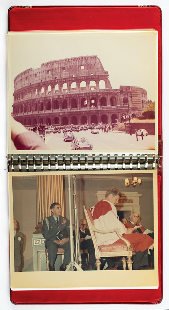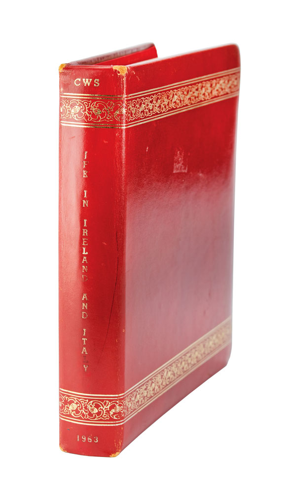 Official White House photographer Cecil W. Stoughton's personal photo album containing 56 original vintage color 8 x 10 photographs of President John F. Kennedy's 1963 trip to Ireland and Italy. The red calf leather photo album is stamped with decorative tooling on the front and back, with the spine stamped with Stoughton's initials, "CWS," and a title, "JFK in Ireland and Italy, 1963." Accompanied by his sisters Eunice Kennedy Shriver and Jean Kennedy Smith, JFK referred to his trip to Ireland as 'the best four days of his life.' The reverse of almost every photograph is hand-inscribed as part of Stoughton's unique numbering and filing system.