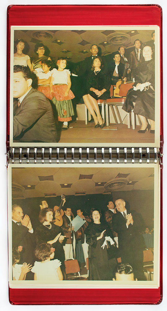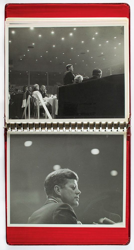 These photographs can be split into three distinct groups, chronicling the rapturous welcome received by the presidential party at Houston International Airport; the banquet hosted in honor of the presidential party at Houston's Rice Hotel, where President Kennedy delivered a 17-minute address to the bilingual audience, and Jackie made some remarks in Spanish; and the presidential party in attendance at a banquet honoring Congressman Albert Thomas at the Sam Houston Coliseum, where JFK acknowledged Thomas's efforts in the development of America's space program. Seen throughout the images are President John F. Kennedy, First Lady Jacqueline Kennedy, Governor John B. Connally, Congressman Albert Thomas, Vice President Lyndon B. Johnson, and others. In fine condition, with the first sleeve in the album discolored, but the photo unaffected.