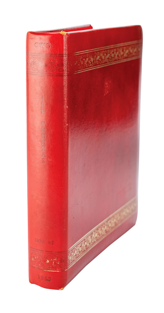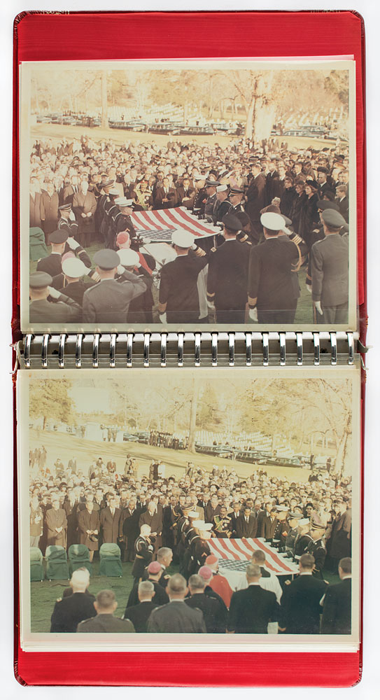 Official White House photographer Cecil W. Stoughton's personal photo album containing 24 original vintage color 8 x 10 photos of President John F. Kennedy's graveside funeral services at Arlington National Cemetery on November 25, 1963. The red calf leather photo album is stamped with decorative tooling on the front and back, with the spine stamped with Stoughton's initials, "CWS," and a title, "JFK Funeral, Nov. #3, 1963." Almost all are hand-inscribed on the reverse as part of Stoughton's unique numbering and filing system.