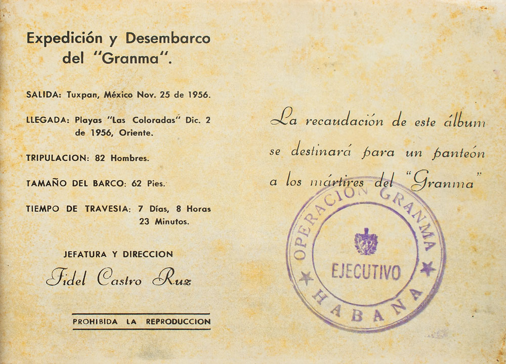Printed pictorial souvenir album titled "Album Expedicionarios del Granma," 6.25 x 4, approximately 42 single-sided pages, no date [circa 1956]. On July 26, 1953, young lawyer-turned-revolutionary Fidel Castro, increasingly critical of the Batista regime, led a group of 135 militants in a raid on the Moncada Barracks, one of Cuba's largest military installations. The operation was a disaster: more than sixty of the raiders were killed, and most of those who escaped—including Castro and his brother Raul—were eventually captured, tried, and imprisoned. After two years, Castro was freed under the terms of a general amnesty and fled to Mexico, where he met Ché Guevara and hatched an even bolder plan. On November 26, 1956, Castro and eighty-two Cuban exiles sailed from Mexico in the Granma, a sixty-foot yacht formerly owned by an American businessman. On December 2, the rebels landed at Los Cayuelos [now Granma Province] and engaged the Cuban Army in a bloody battle that decimated their ranks. The bloodied but unbowed Castro brothers, together with a small cadre of their compadres, escaped to the Sierra Maestra mountains. From that base of operations, they continued to gain popular support and waged the fierce guerrilla war that would ultimately topple the Batista regime—and make Castro the most powerful man in Cuba. The present item, a souvenir of the historic Granma expedition, was published as a tribute to all eighty-two participants. Each single-sided page bears the photographs of two of the rebels within pictorial frames illustrated with "revolutionary" vignettes. The book begins with the twenty-seven men who died in the raid, each of whom is identified with a one-word caption: "martir." In very good condition, with heavy wear to the covers and tape to front hinge; interior pages show some foxing.