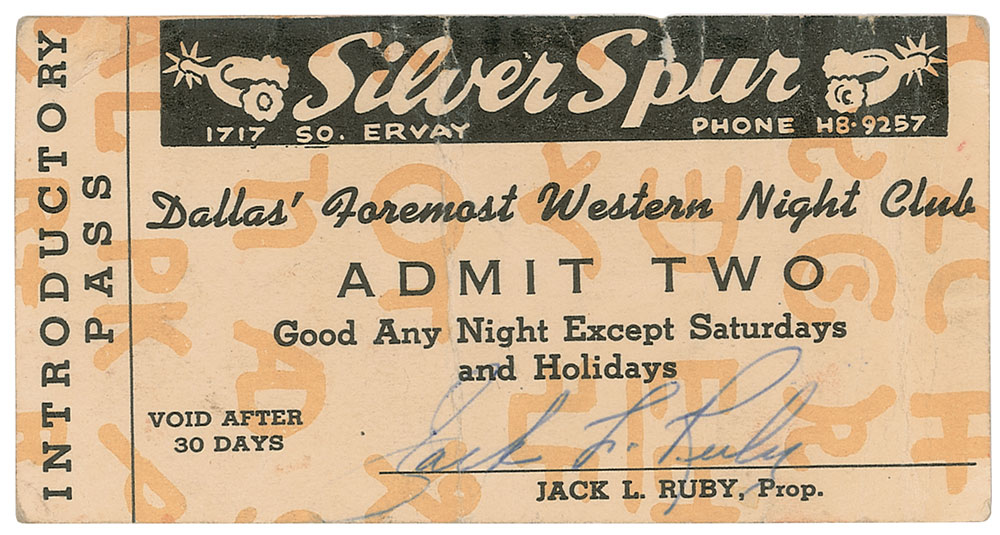 Cardstock introductory admittance pass for the Silver Spur nightclub, 4.25 x 2.25, signed at the bottom in blue ballpoint, "Jack L. Ruby." In very good condition, with vertical folds and overall creasing. Billed as "Dallas' Foremost Western Night Club," it was located at 1717 South Ervay Street.