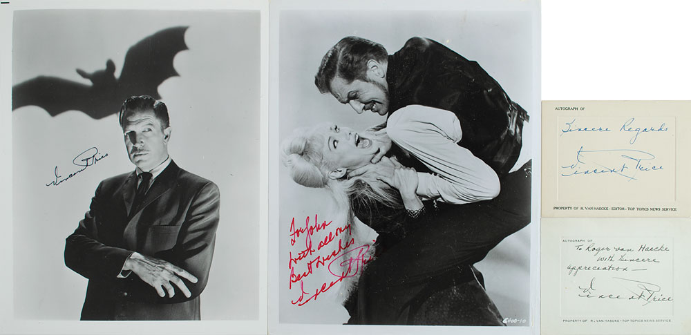 Four items: a glossy 8 x 10 photo of Price with the shadow of a bat in the background, signed in black felt tip; a glossy 8 x 10 photo of Price strangling a woman, signed and inscribed in red felt tip, "For John, with all my best wishes, Vincent Price"; and two vintage fountain pen signatures on individual 4.5 x 3.5 cards (one inscribed to "Roger van Haecke"). In fine condition.
