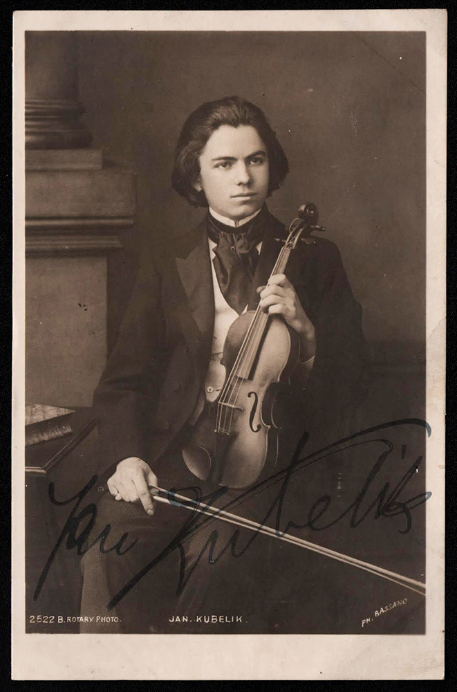 Matte-finish 3.5 x 5.25 postcard photo of the young musician posing with his violin, signed boldly in black ink, "Jan Kubelik." In fine condition.