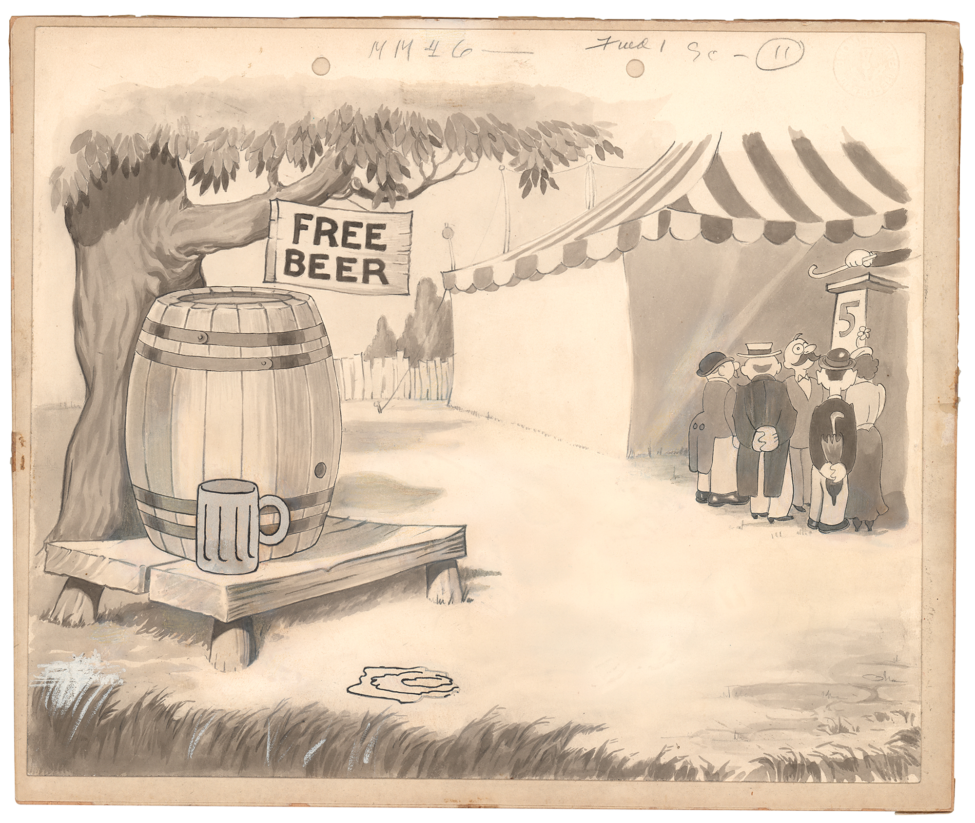 (Warner Brothers Studios, 1934) Original production background featuring the fairground from Those Were Wonderful Days, showing a barrel and mug with a "Free Beer" sign hanging above. Set in 1898, the cartoon offers a nostalgic look at the United States at the turn of the century, leading up to the annual Fourth of July celebration at the local fairground. Accomplished in pen and ink on an 11.25 x 9.5 sheet, affixed to a slightly larger mount. In fine condition.