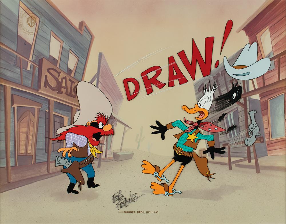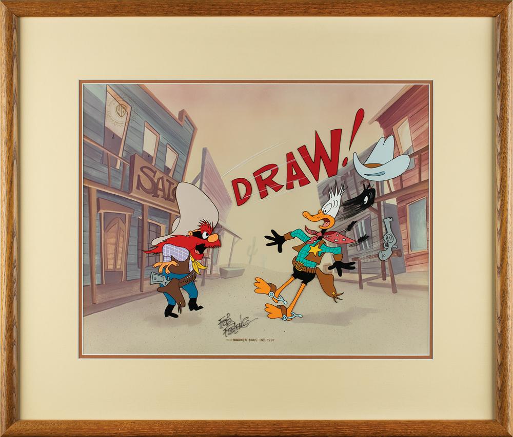 (Warner Brothers Studios, 1992) Limited edition hand-painted cel entitled 'Draw!,' released in an edition of 750 and sold out for over two decades, signed at the bottom in black felt tip by Friz Freleng (1906-1995). The cel depicts Yosemite Sam and Daffy Duck in a classic western showdown scene! Double-matted and framed to an overall size of 23.75 x 20. In fine condition.