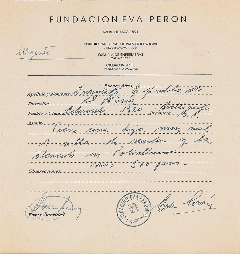 ADS in Spanish, signed "Eva Peron," one page, 7.75 x 8.25, no date but circa 1948-1952. Document from the Eva Peron Foundation, filled out in her hand and signed at the conclusion. In fine condition, with some light creasing and intersecting folds.