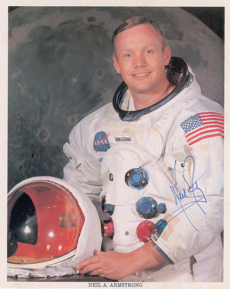 Official color 8 x 10 NASA lithograph of Armstrong posing in his white space suit against a lunar background, nicely signed in blue felt tip. In very good condition, with light scattered staining and spotting (some on Armstrong's face, visible only at an angle), a faint vertical bend, and a paperclip impression to the top edge. Accompanied by the original NASA mailing envelope. Uninscribed white space suit photos of Armstrong are especially highly sought after.