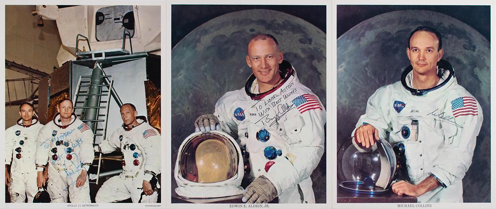 Three photos signed by an astronaut from the historic Apollo 11 mission: an uncommon color glossy 8 x 10 JFK Space Center lithograph of the Apollo 11 crew posing in front of the lunar module, signed and inscribed in blue felt tip, “To Matthew—Best wishes, Neil Armstrong”; an official color 8 x 10 NASA lithograph of Buzz Aldrin posing in his white space suit against a lunar backdrop, signed and inscribed in black felt tip, “To Lionel Aucoin, with best wishes, Buzz Aldrin”; and an official color 8 x 10 NASA lithograph of Michael Collins posing in his white space suit against a lunar backdrop, signed in black felt tip, “M. Collins.” In overall fine condition.