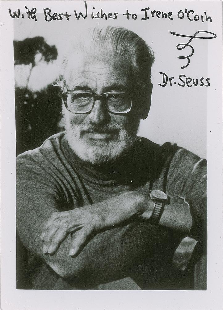 Glossy 3.5 x 5 photo of the beloved children's author, signed and inscribed in black felt tip, "With best wishes to Irene O'Coin, Dr. Seuss." In fine condition, with a light postal impression just touching Seuss's beard.